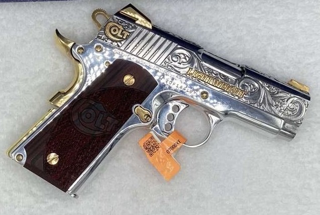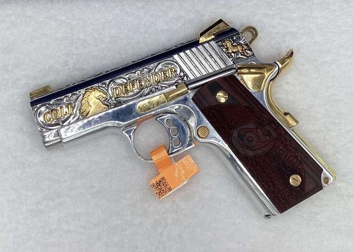 The Colt Defender pistol is a carry-ready 1911 in a compact size. Tactical G10 grips and upswept beavertail grip safety makes this small pistol very comfortable to shoot. The Defender also features a lightweight aluminum frame. This Beautiful Exclusive 3D FULLY ENGRAVED CUSTOM Colt Defender has been finished in High Polished Nickel frame, slide, trigger, slide, and Magazine! This Exclusive Custom Colt Defender is also Fully Engraved, with 24K Gold 3D Custom Engraving, and topped off with 24K Gold Plated accessories, including the Novak Adjustable Sights 24K Gold Plated to make this custom firearm stand out above all the rest and be the envy of the range! Get yours now before it is gone for good!